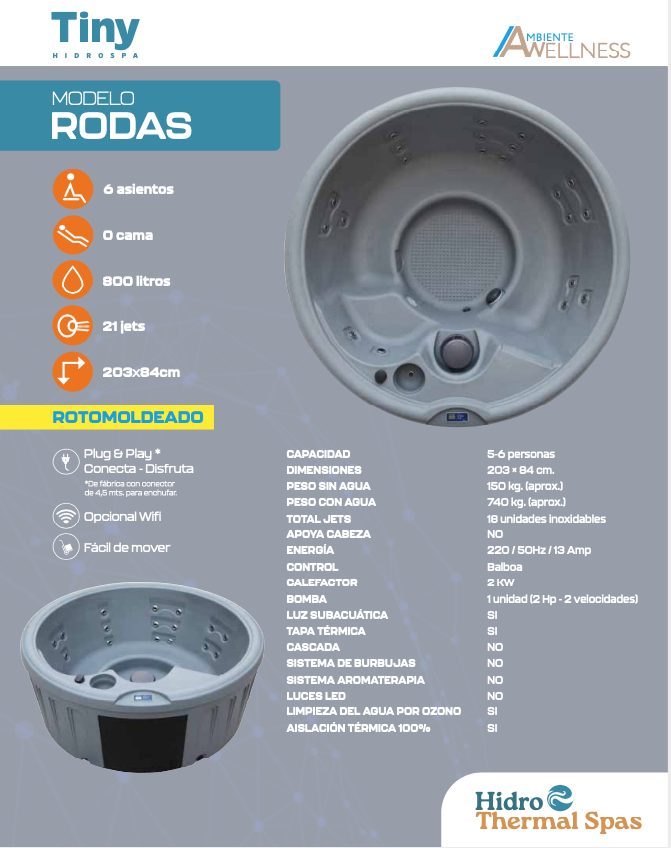 Rodas es un equipo de versátil, moderno, de fácil traslado que te brindará masajes envolventes a un precio justo para tu comodidad, la colección Tiny Hidrospa es la elección perfecta para que puedas crear tu oasis en el lugar que estimes.
